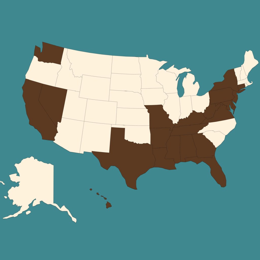 Alabama, Arkansas, California, Connecticut, Delaware, Florida, Georgia, Hawaii, Kentucky, Louisiana, Maryland, Mississippi, Missouri, Nevada, New Jersey, New York, Pennsylvania, Tennessee, Texas, Virginia, Washington, (Washington D.C.), West Virginia